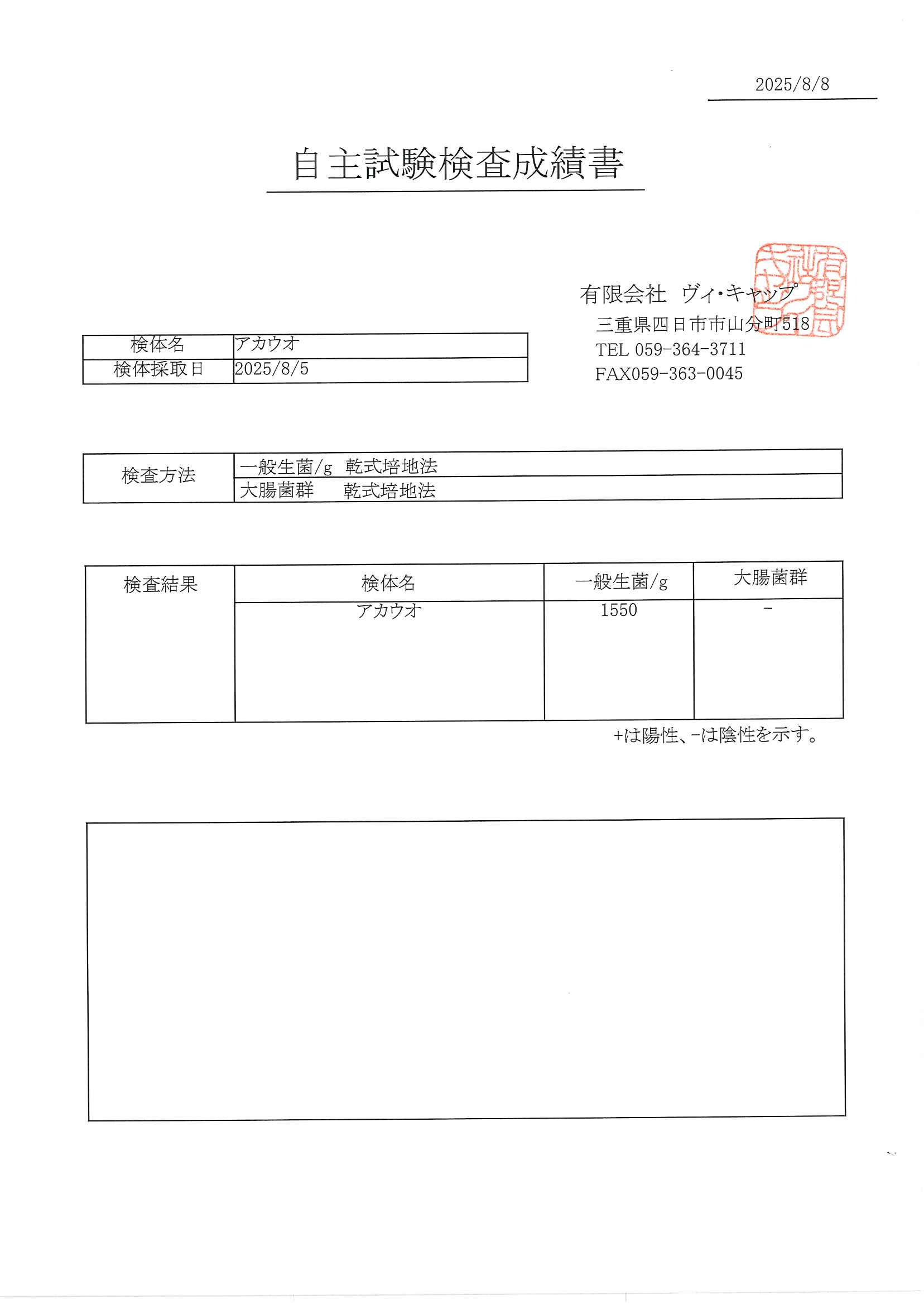2025年8月8日 | アカウオ | 一般生菌/g 乾式培地法 大腸菌 乾式培地法 | ダウンロード |