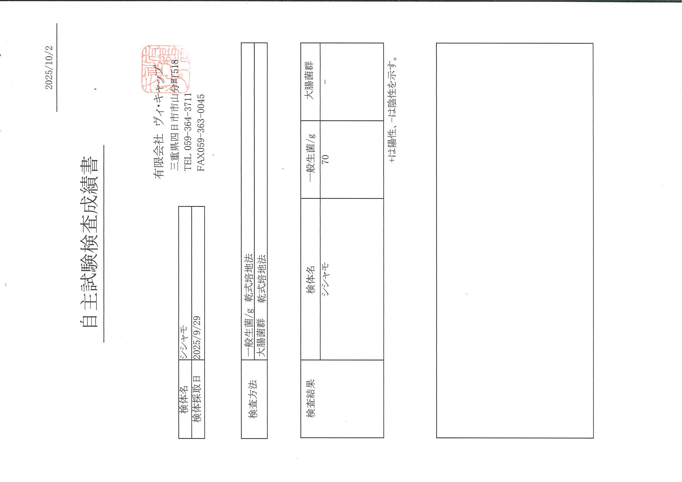 | 2025年10月2日 | シシャモ | 一般生菌/g 乾式培地法 大腸菌 乾式培地法 | ダウンロード |