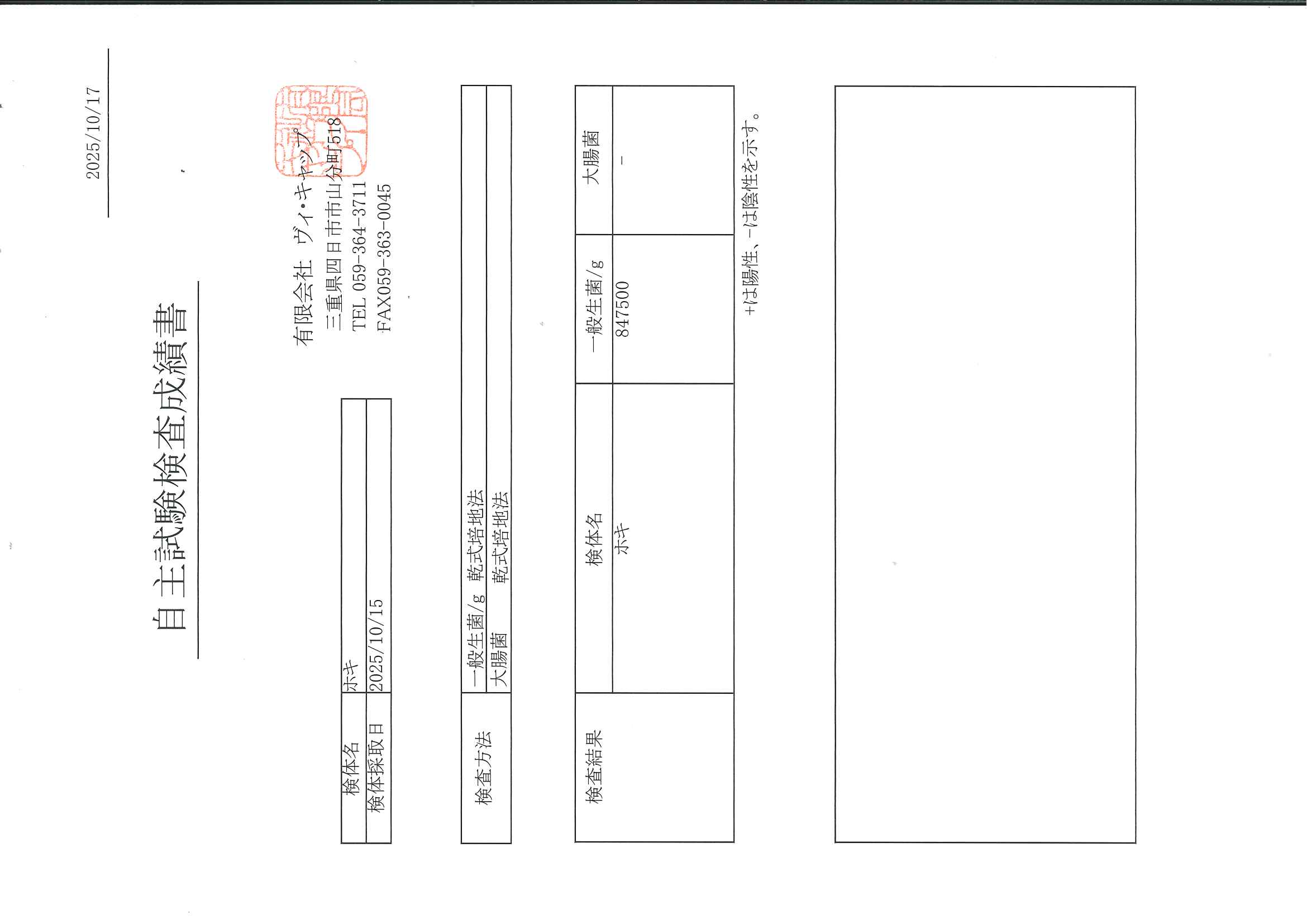 | 2025年10月17日 | ホキ | 一般生菌/g 乾式培地法 大腸菌 乾式培地法 | ダウンロード |