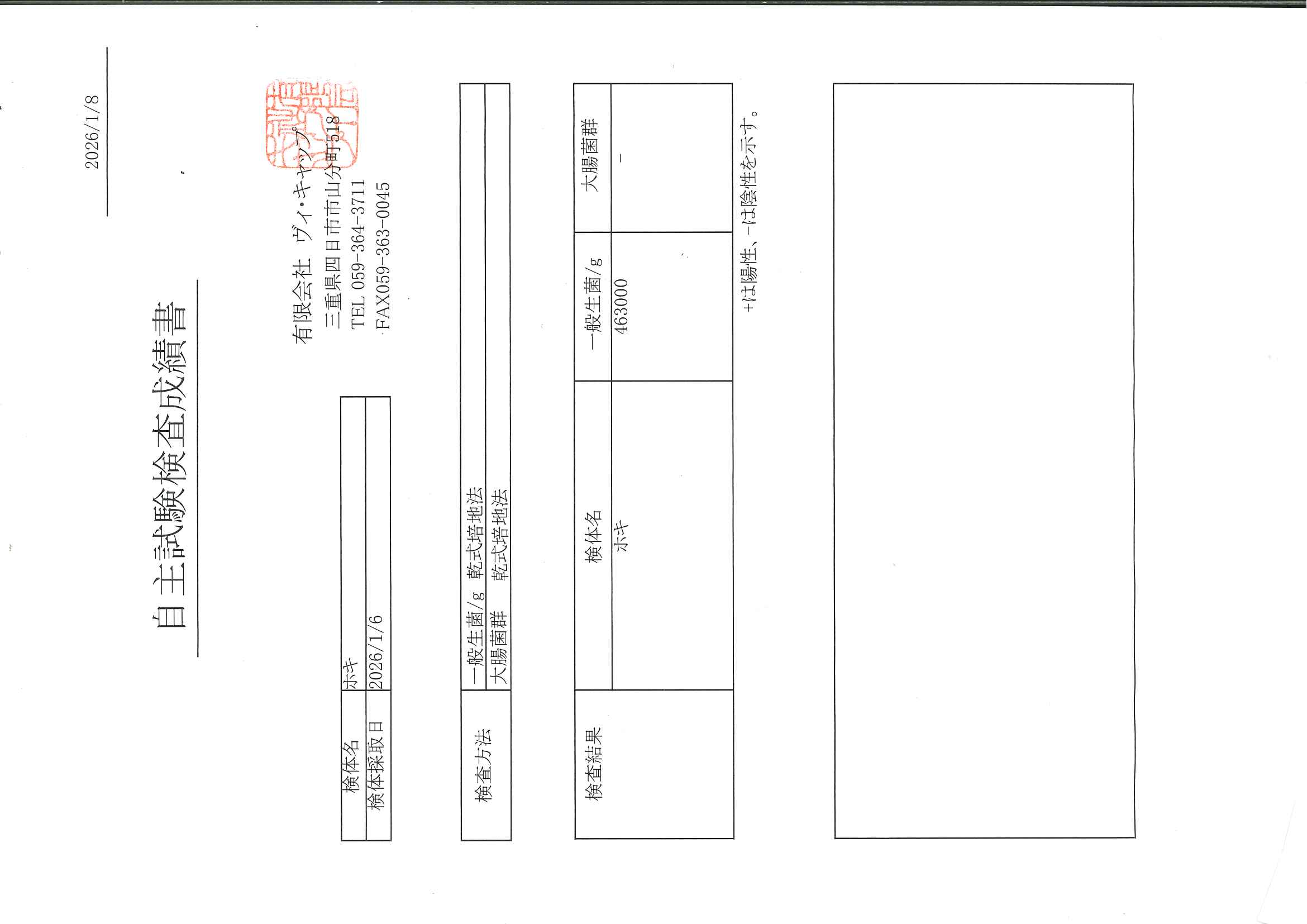 | 2026年1月8日 | ホキ | 一般生菌/g 乾式培地法 大腸菌 乾式培地法 | ダウンロード |