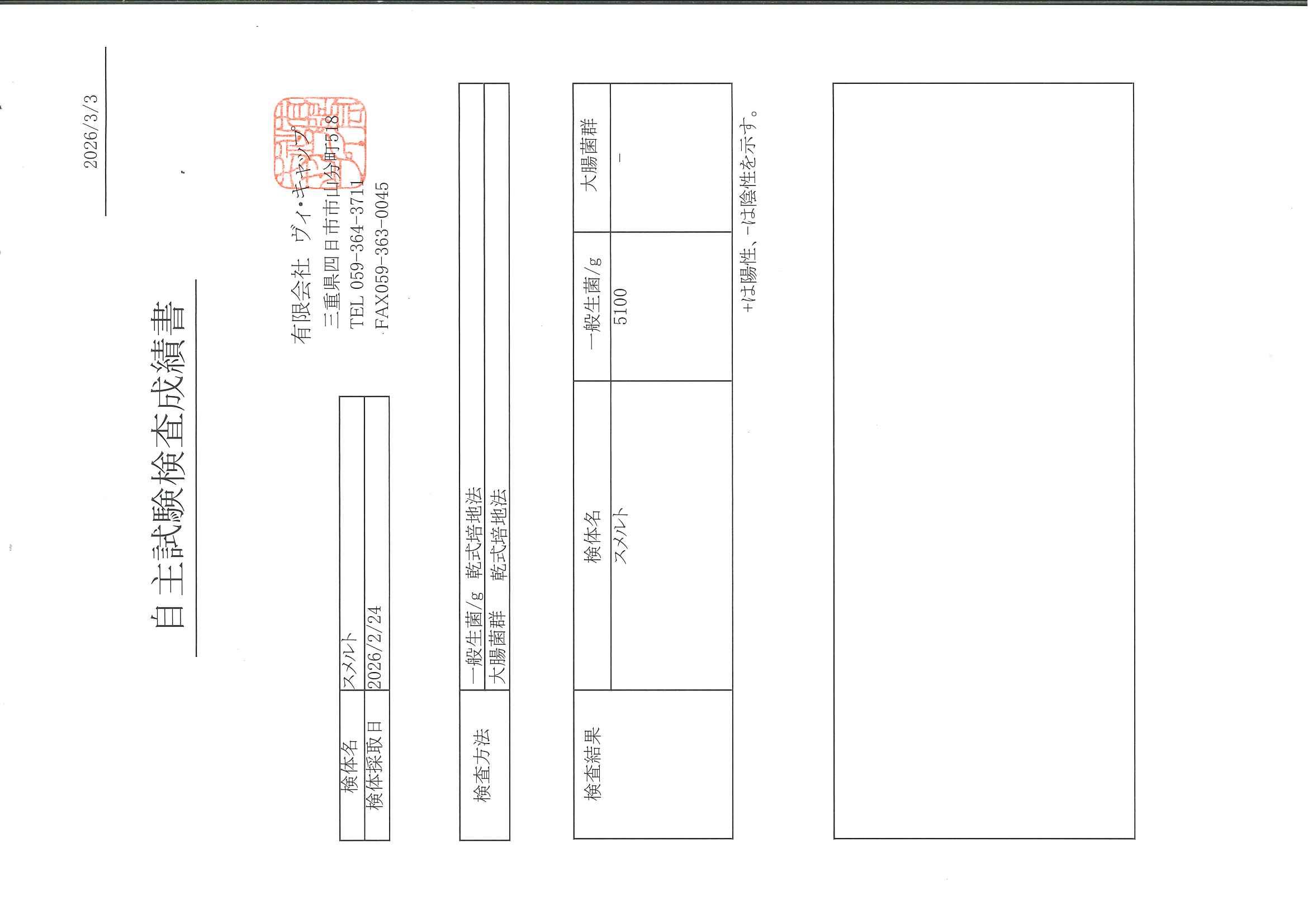 | 2026年3月3日 | スメルト | 一般生菌/g 乾式培地法 大腸菌 乾式培地法 | ダウンロード |