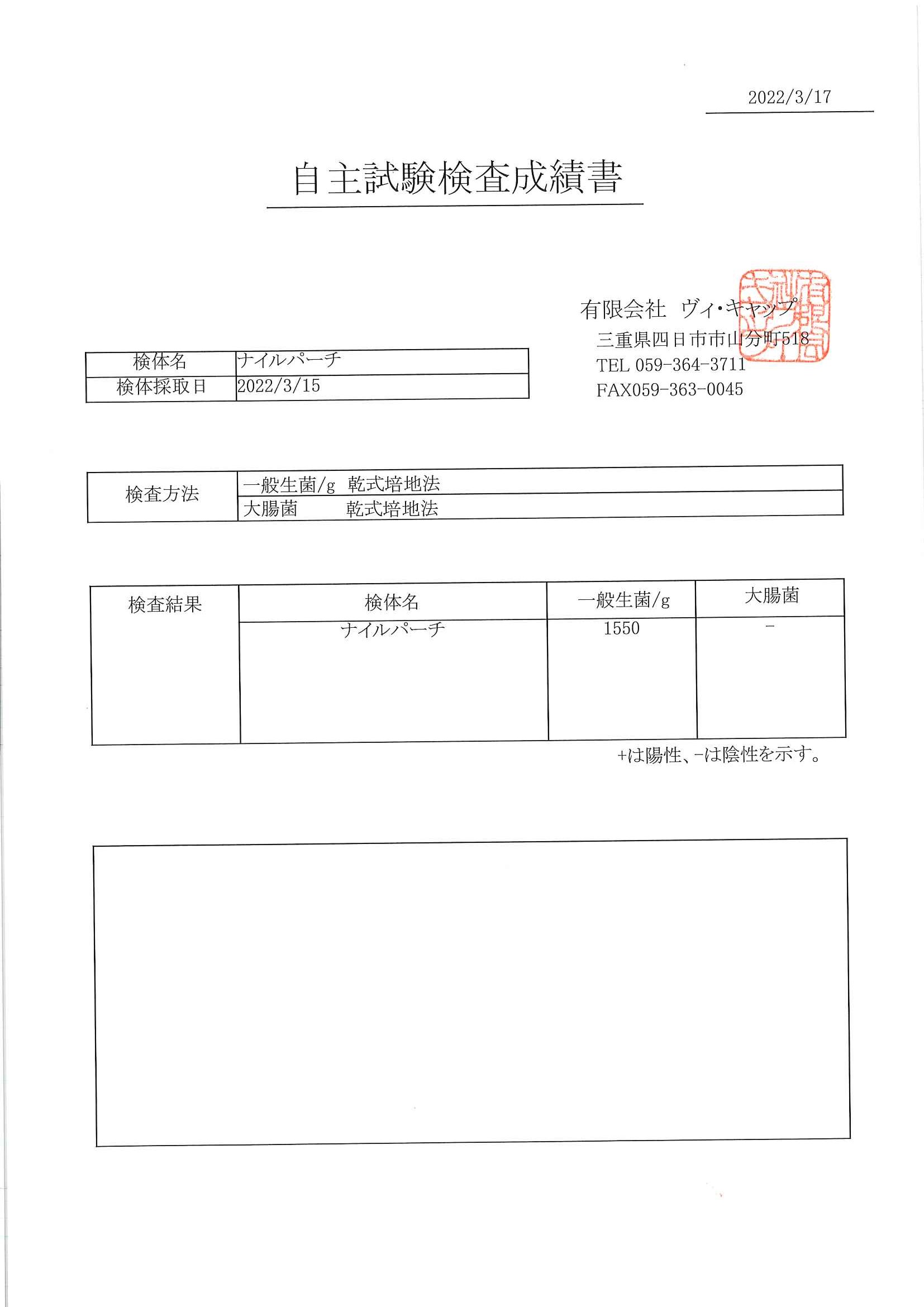 | 2022年3月17日 | ナイルパーチ | 一般生菌/g 乾式培地法 大腸菌 乾式培地法 | ダウンロード |